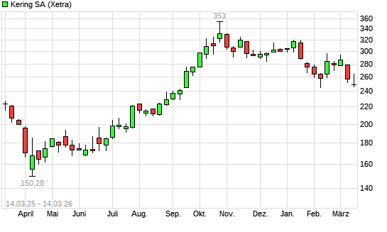 Mit dem Rücksetzer auf 247,25 EUR hat die Kering-Aktie (ISIN FR0000121485) am 13.03.2026 ein neues 6-Monats-Tief erreicht und damit den Kurs vom 09.03.2026 eingestellt.
