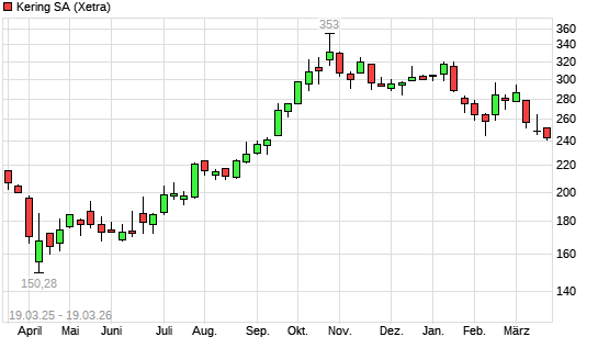 Mit dem Rücksetzer auf 244,20 EUR hat die Kering-Aktie (ISIN FR0000121485) am 18.03.2026 ein neues 6-Monats-Tief erreicht und damit den Kurs vom 13.03.2026 eingestellt.