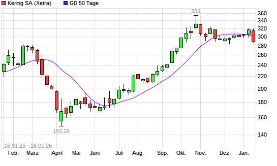 Mit dem Rücksetzer auf 300,10 EUR hat die Kering-Aktie am 15.01.2026 die 50-Tage-Linie nach unten gekreuzt.