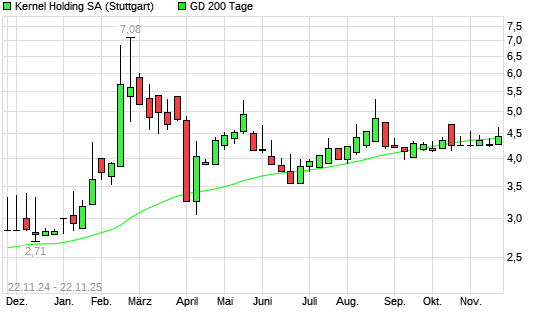 Mit dem Anstieg auf 4,70 EUR hat die Kernel Holding-Aktie am 21.11.2025 die 200-Tage-Linie nach oben gekreuzt.