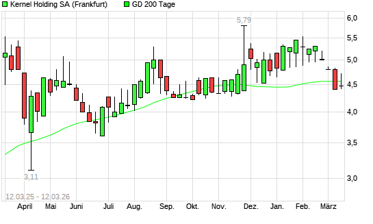 Mit dem Rücksetzer auf 4,48 EUR hat die Kernel Holding-Aktie am 11.03.2026 die 200-Tage-Linie nach unten gekreuzt.