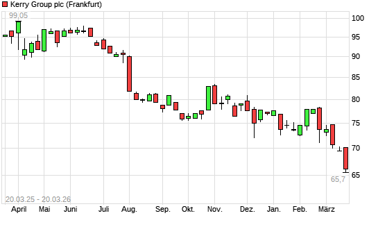 Mit dem Rücksetzer auf 65,70 EUR hat die Kerry Group-Aktie (ISIN IE0004906560) am 19.03.2026 ein neues 5-Jahres-Tief erreicht und damit den Kurs vom 18.03.2026 eingestellt.