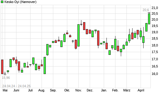 Mit dem Anstieg auf 20,56 EUR hat die Kesko B-Aktie (ISIN FI0009000202) am 23.04.2025 ein neues 12-Monats-Hoch erreicht und damit den Kurs vom 06.11.2024 eingestellt.