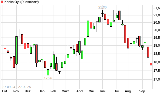 Mit dem Rücksetzer auf 17,89 EUR hat die Kesko B-Aktie (ISIN FI0009000202) am 26.09.2025 ein neues 6-Monats-Tief erreicht und damit den Kurs vom 09.04.2025 eingestellt.