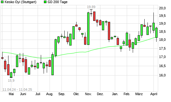 Mit dem Anstieg auf 19,29 EUR hat die Kesko B-Aktie am 10.04.2025 die 200-Tage-Linie nach oben gekreuzt.