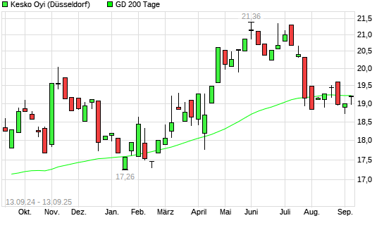 Mit dem Anstieg auf 19,28 EUR hat die Kesko B-Aktie am 12.09.2025 die 200-Tage-Linie nach oben gekreuzt.