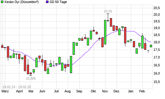 Mit dem Rücksetzer auf 17,93 EUR hat die Kesko B-Aktie am 18.02.2025 die 50-Tage-Linie nach unten gekreuzt.