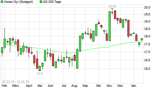 Mit dem Anstieg auf 17,79 EUR hat die Kesko B-Aktie am 20.01.2025 die 200-Tage-Linie nach oben gekreuzt.Die Kesko B-Aktie befand sich seit dem 13.01.2025 im langfristigen Abwärtstrend und hat ...weiterlesen