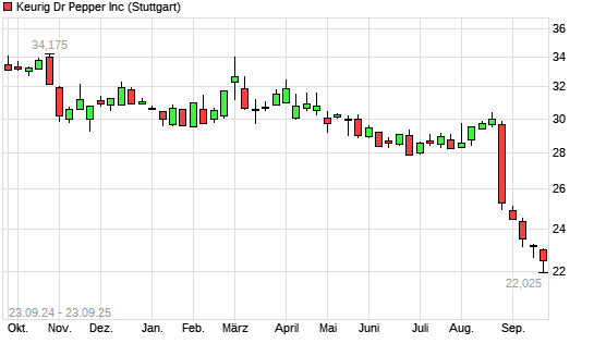 Mit dem Rücksetzer auf 22,00 EUR hat die Keurig Dr Pepper-Aktie (ISIN US49271V1008) am 22.09.2025 ein neues 5-Jahres-Tief erreicht und damit den Kurs vom 15.09.2025 eingestellt.