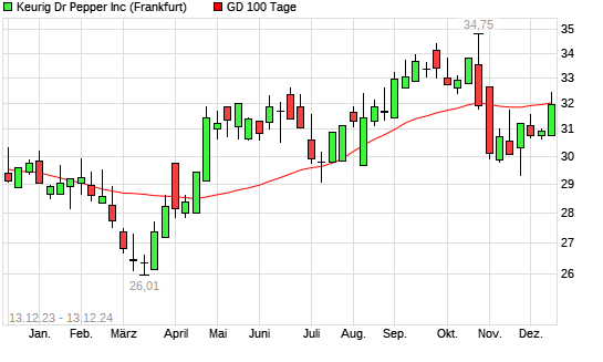 Mit dem Anstieg auf 32,18 EUR hat die Keurig Dr Pepper-Aktie am 12.12.2024 die 100-Tage-Linie nach oben gekreuzt.
