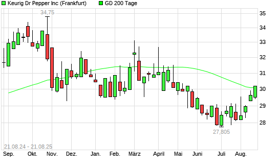Mit dem Anstieg auf 30,17 EUR hat die Keurig Dr Pepper-Aktie am 20.08.2025 die 200-Tage-Linie nach oben gekreuzt.