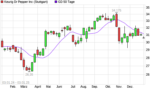 Mit dem Anstieg auf 30,94 EUR hat die Keurig Dr Pepper-Aktie am 02.01.2025 die 50-Tage-Linie nach oben gekreuzt.