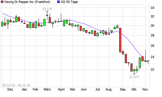 Mit dem Anstieg auf 23,32 EUR hat die Keurig Dr Pepper-Aktie am 04.11.2025 die 50-Tage-Linie nach oben gekreuzt.