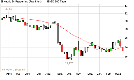 Mit dem Rücksetzer auf 23,80 EUR hat die Keurig Dr Pepper-Aktie am 11.03.2026 die 100-Tage-Linie nach unten gekreuzt.