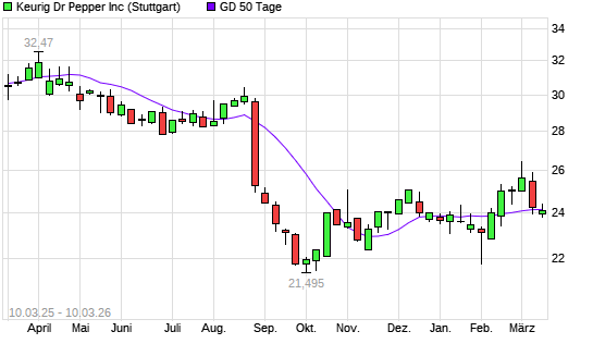 Mit dem Rücksetzer auf 24,01 EUR hat die Keurig Dr Pepper-Aktie am 09.03.2026 die 50-Tage-Linie nach unten gekreuzt.