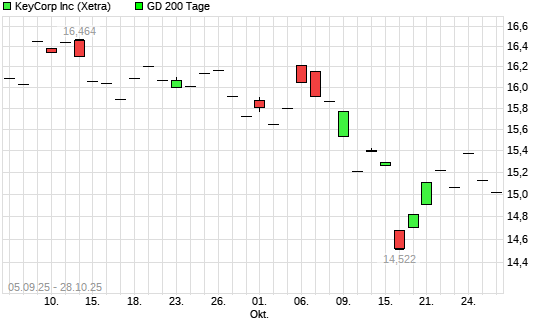 Mit dem Anstieg auf 15,28 EUR hat die KeyCorp-Aktie am 27.10.2025 die 200-Tage-Linie nach oben gekreuzt.