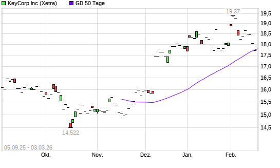 Mit dem Rücksetzer auf 17,32 EUR hat die KeyCorp-Aktie am 02.03.2026 die 50-Tage-Linie nach unten gekreuzt.Die KeyCorp-Aktie befindet sich seit dem 20.11.2025 im ...weiterlesen