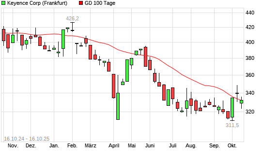 Mit dem Anstieg auf 335,80 EUR hat die Keyence-Aktie am 15.10.2025 die 100-Tage-Linie nach oben gekreuzt.