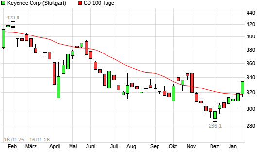 Mit dem Anstieg auf 328,60 EUR hat die Keyence-Aktie am 15.01.2026 die 100-Tage-Linie nach oben gekreuzt.