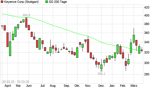 Mit dem Rücksetzer auf 319,90 EUR hat die Keyence-Aktie am 19.03.2026 die 200-Tage-Linie nach unten gekreuzt.