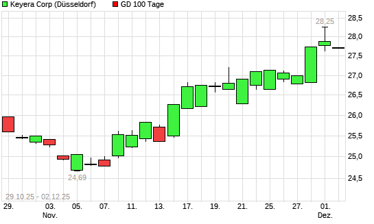 Mit dem Anstieg auf 27,71 EUR hat die Keyera-Aktie am 01.12.2025 die 100-Tage-Linie nach oben gekreuzt.