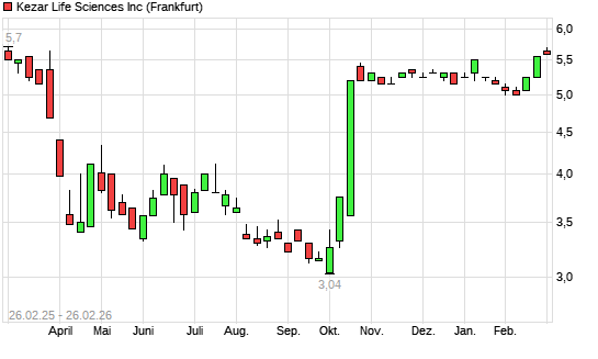 Mit dem Anstieg auf 5,70 EUR hat die Kezar Life Sciences-Aktie (ISIN US49372L2097) am 25.02.2026 ein neues 6-Monats-Hoch erreicht und damit den Kurs vom 23.02.2026 eingestellt.