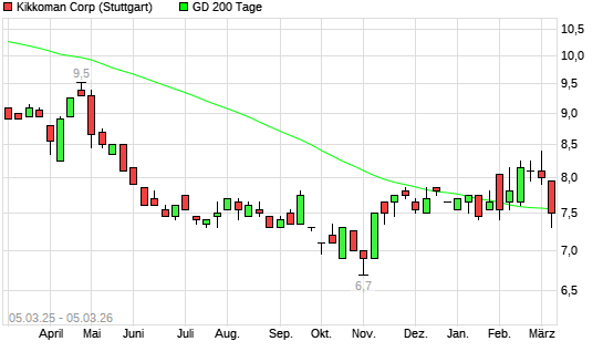 Mit dem Anstieg auf 7,90 EUR hat die Kikkoman-Aktie am 04.03.2026 die 200-Tage-Linie nach oben gekreuzt.