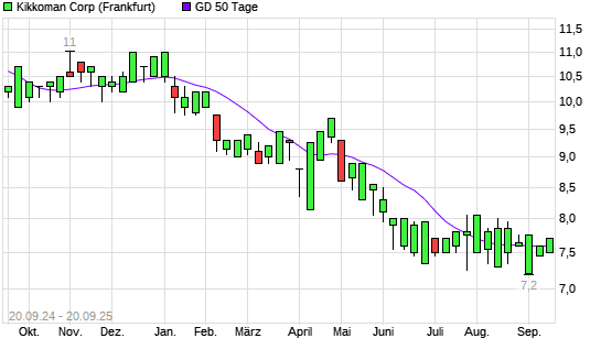 Mit dem Anstieg auf 7,70 EUR hat die Kikkoman-Aktie am 19.09.2025 die 50-Tage-Linie nach oben gekreuzt.