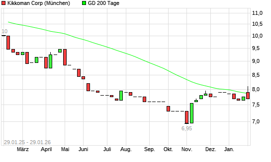 Mit dem Rücksetzer auf 7,70 EUR hat die Kikkoman-Aktie am 28.01.2026 die 200-Tage-Linie nach unten gekreuzt.