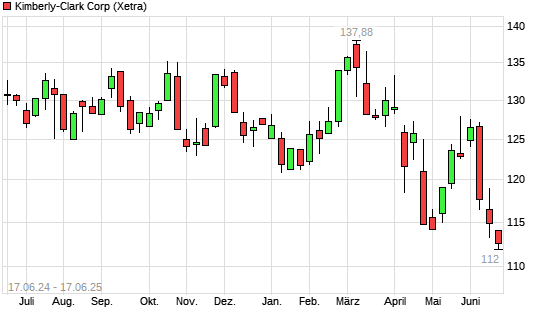 Mit dem Rücksetzer auf 112,96 EUR hat die Kimberly-Clark-Aktie (ISIN US4943681035) am 16.06.2025 ein neues 12-Monats-Tief erreicht und damit den Kurs vom 30.04.2025 eingestellt.
