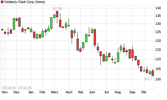 Mit dem Rücksetzer auf 102,00 EUR hat die Kimberly-Clark-Aktie (ISIN US4943681035) am 23.10.2025 ein neues 5-Jahres-Tief erreicht und damit den Kurs vom 13.10.2025 eingestellt.