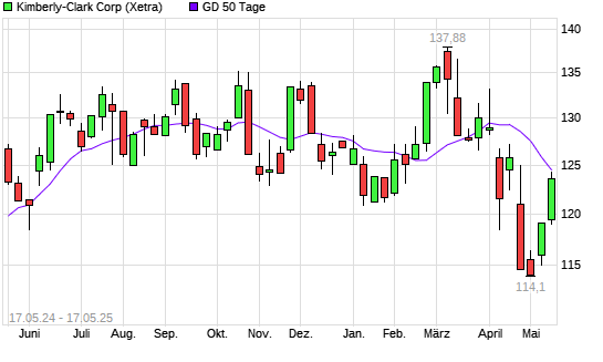 Mit dem Anstieg auf 123,94 EUR hat die Kimberly-Clark-Aktie am 16.05.2025 die 50-Tage-Linie nach oben gekreuzt.