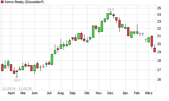 Mit dem Rücksetzer auf 19,50 EUR hat die Kimco Realty-Aktie (ISIN US49446R1095) am 10.03.2025 ein neues 6-Monats-Tief erreicht und damit den Kurs vom 07.03.2025 eingestellt.