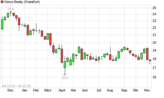 Mit dem Rücksetzer auf 17,60 EUR hat die Kimco Realty-Aktie (ISIN US49446R1095) am 03.11.2025 ein neues 6-Monats-Tief erreicht und damit den Kurs vom 25.06.2025 eingestellt.