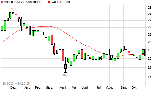Mit dem Rücksetzer auf 18,40 EUR hat die Kimco Realty-Aktie am 29.10.2025 die 100-Tage-Linie nach unten gekreuzt.Die Kimco Realty-Aktie befindet sich seit dem 28.10.2025 im langfristigen ...weiterlesen