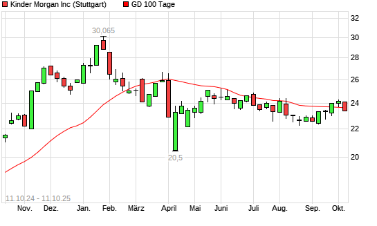 Mit dem Rücksetzer auf 23,43 EUR hat die Kinder Morgan-Aktie am 10.10.2025 die 100-Tage-Linie nach unten gekreuzt.