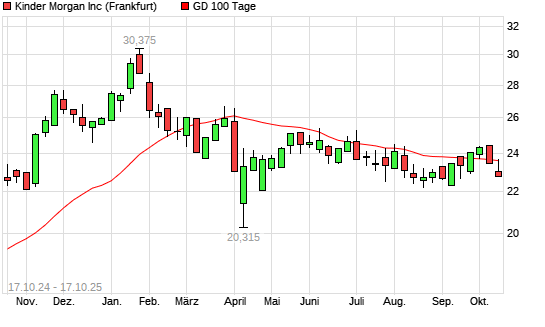 Mit dem Rücksetzer auf 23,22 EUR hat die Kinder Morgan-Aktie am 16.10.2025 die 100-Tage-Linie nach unten gekreuzt.Die Kinder Morgan-Aktie befindet sich seit dem 01.07.2025 im langfristigen ...weiterlesen