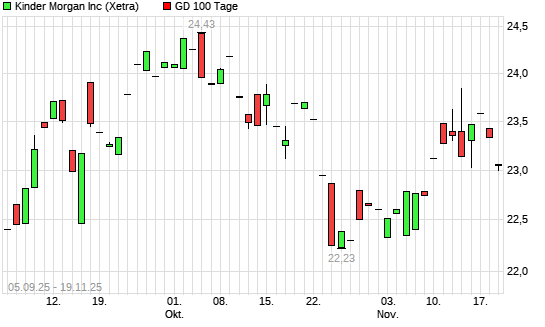 Mit dem Rücksetzer auf 23,26 EUR hat die Kinder Morgan-Aktie am 18.11.2025 die 100-Tage-Linie nach unten gekreuzt.Die Kinder Morgan-Aktie befindet sich seit dem 01.07.2025 ...weiterlesen