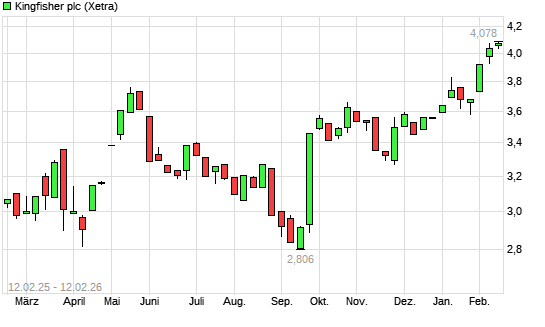 Mit dem Anstieg auf 4,06 EUR hat die Kingfisher-Aktie (ISIN GB0033195214) am 11.02.2026 ein neues 3-Jahres-Hoch erreicht und damit den Kurs vom 04.02.2026 eingestellt.