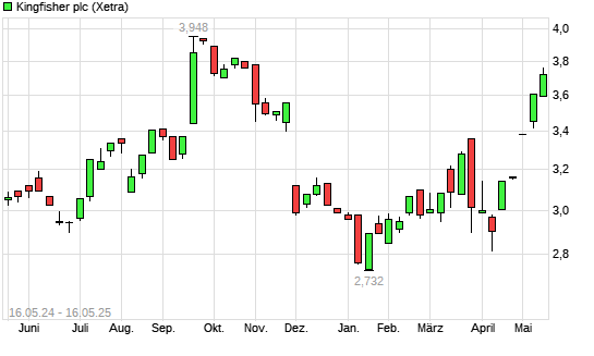 Mit dem Anstieg auf 3,76 EUR hat die Kingfisher-Aktie (ISIN GB0033195214) am 15.05.2025 ein neues 6-Monats-Hoch erreicht und damit den Kurs vom 14.05.2025 eingestellt.