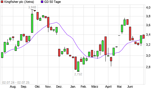 Mit dem Anstieg auf 3,40 EUR hat die Kingfisher-Aktie am 01.07.2025 die 50-Tage-Linie nach oben gekreuzt.