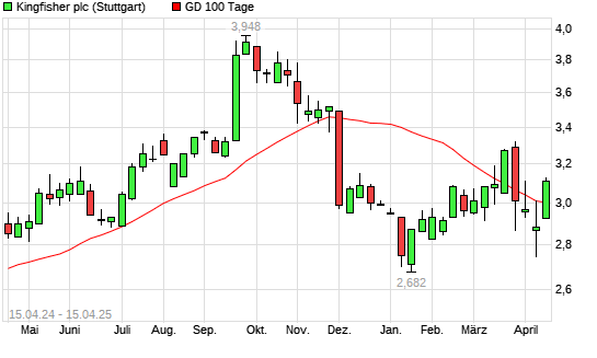 Mit dem Anstieg auf 3,00 EUR hat die Kingfisher-Aktie am 14.04.2025 die 100-Tage-Linie nach oben gekreuzt.Die Kingfisher-Aktie befindet sich seit dem 25.03.2025 im langfristigen Abwärtstrend ...weiterlesen