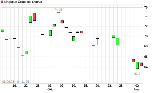 Mit dem Rücksetzer auf 64,20 EUR hat die Kingspan Group-Aktie (ISIN IE0004927939) am 03.11.2025 ein neues 6-Monats-Tief erreicht und damit den Kurs vom 03.09.2025 eingestellt.