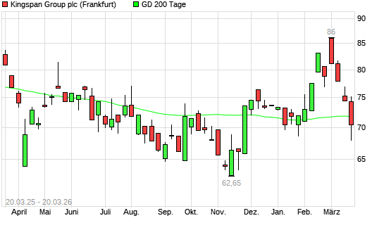 Mit dem Rücksetzer auf 68,50 EUR hat die Kingspan Group-Aktie am 19.03.2026 die 200-Tage-Linie nach unten gekreuzt.