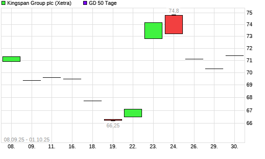 Mit dem Rücksetzer auf 68,95 EUR hat die Kingspan Group-Aktie am 30.09.2025 die 50-Tage-Linie nach unten gekreuzt.