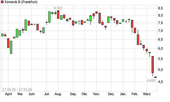 Mit dem Rücksetzer auf 4,70 EUR hat die Kinnevik B-Aktie (ISIN SE0022060521) am 16.03.2026 ein neues 10-Jahres-Tief erreicht und damit den Kurs vom 12.03.2026 eingestellt.
