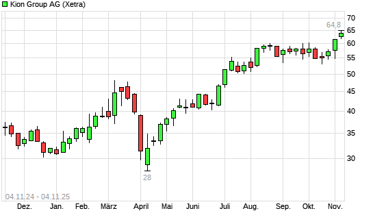 Mit dem Anstieg auf 64,45 EUR hat die Kion Group-Aktie (ISIN DE000KGX8881) am 03.11.2025 ein neues 3-Jahres-Hoch erreicht und damit den Kurs vom 31.10.2025 eingestellt.