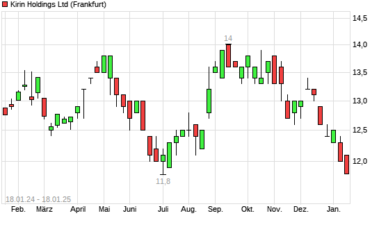 Mit dem Rücksetzer auf 11,80 EUR hat die Kirin Holdings-Aktie (ISIN JP3258000003) am 17.01.2025 ein neues 6-Monats-Tief erreicht und damit den Kurs vom 09.01.2025 eingestellt.