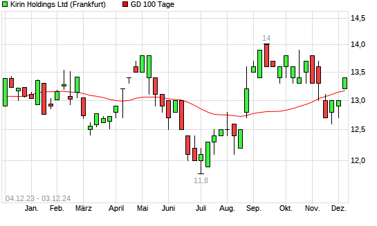 Mit dem Anstieg auf 13,20 EUR hat die Kirin Holdings-Aktie am 02.12.2024 die 100-Tage-Linie nach oben gekreuzt.