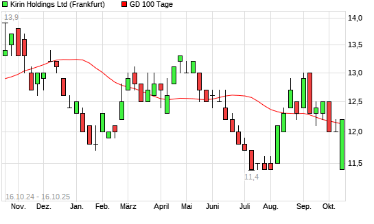 Mit dem Anstieg auf 12,20 EUR hat die Kirin Holdings-Aktie am 15.10.2025 die 100-Tage-Linie nach oben gekreuzt.